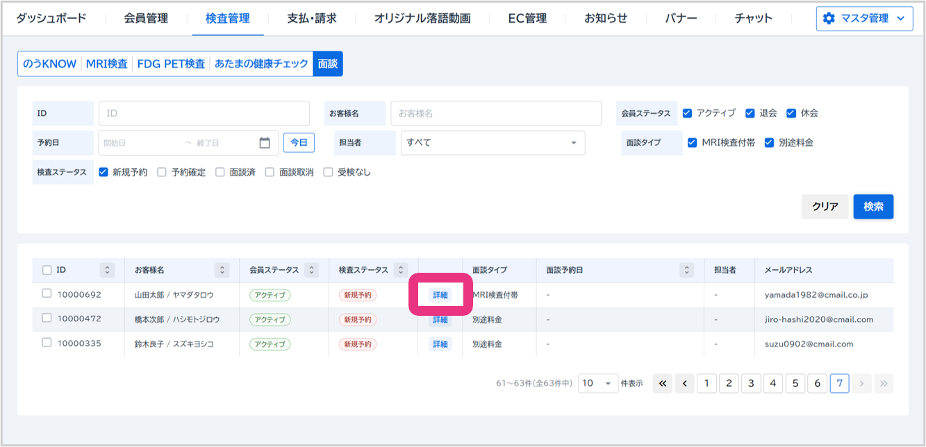 | 詳細 | 『詳細』をクリックすると会員詳細の検査画面が開きます。 |