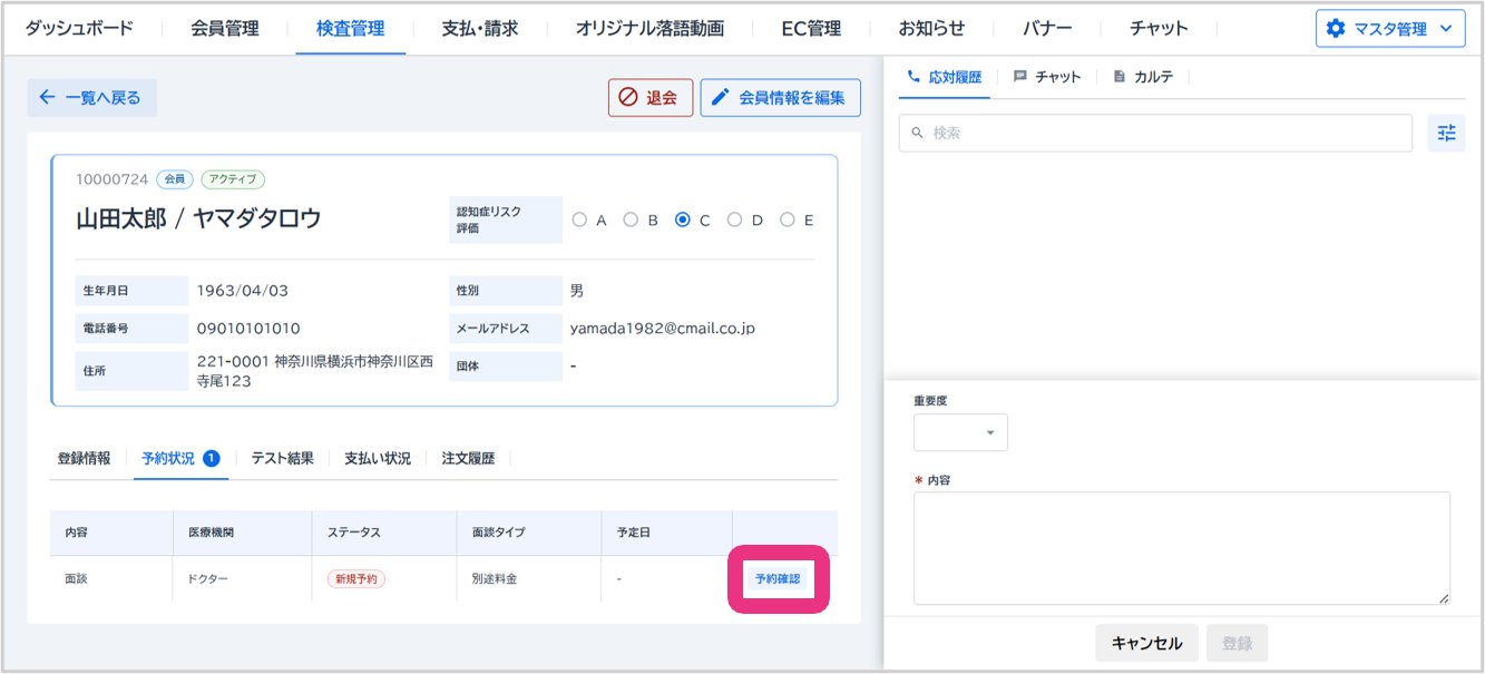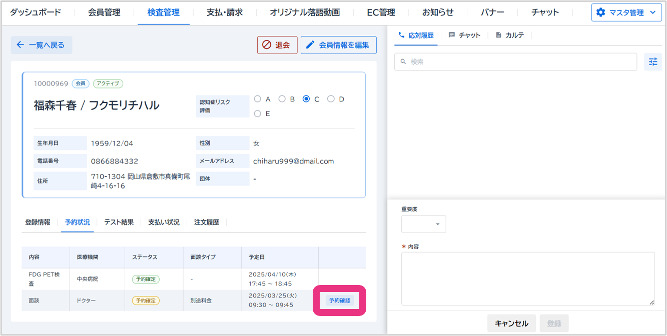 会員詳細の「予約状況」タブが表示されますので、該当のオンライン面談の『予約確認』をクリックしてください。