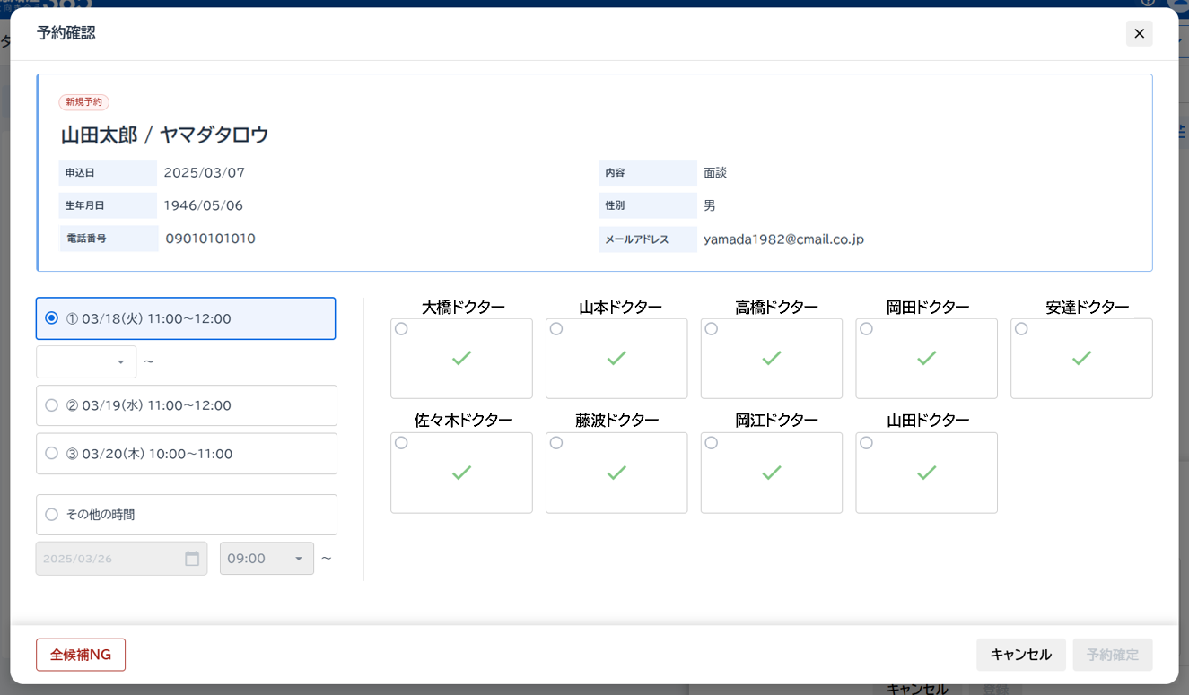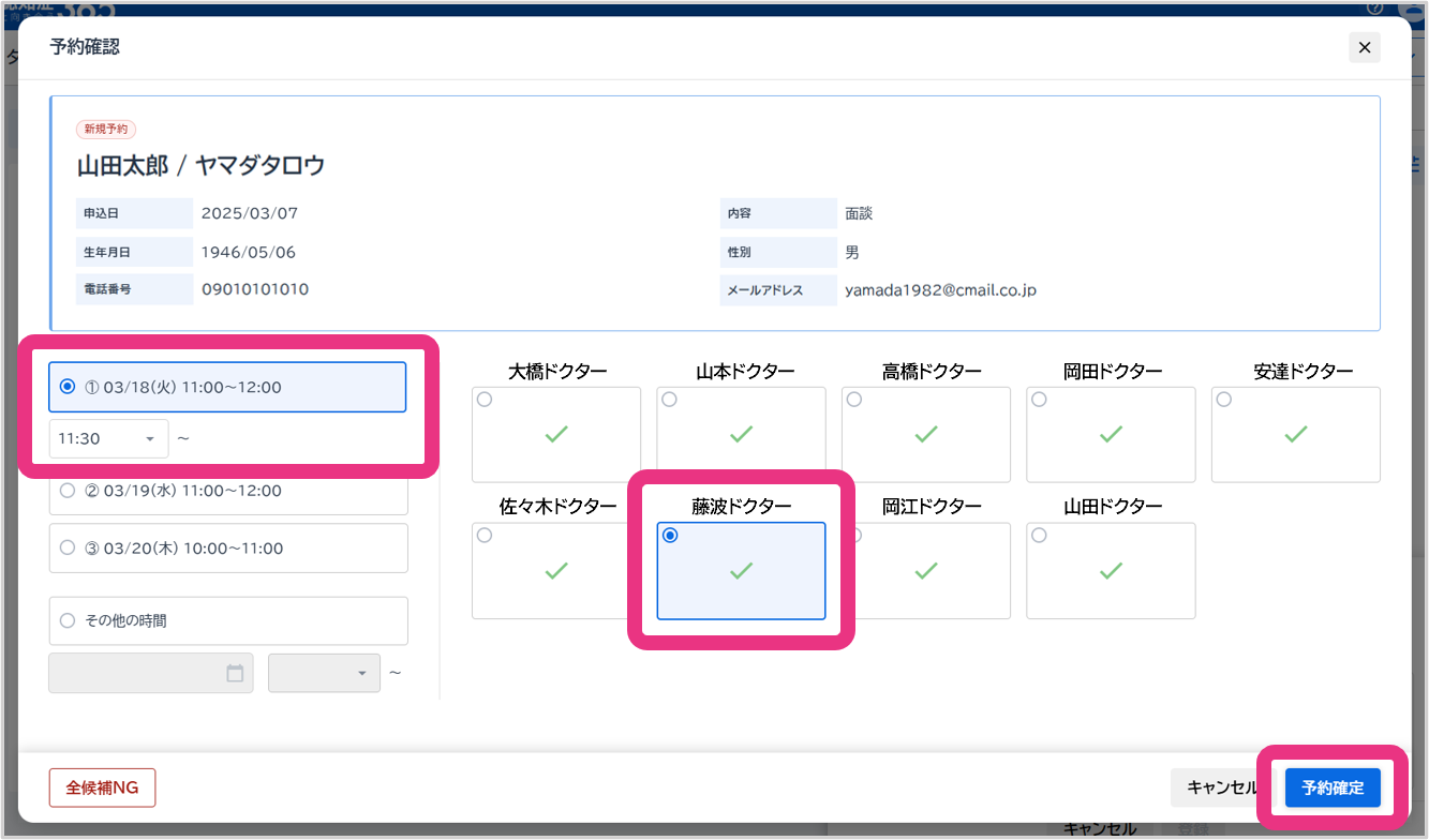 候補日の中から面談可能な日時と担当ドクターを選択し、『予約確定』をクリックしてください。会員宛てに面談日時確定の案内メールが送信されます。