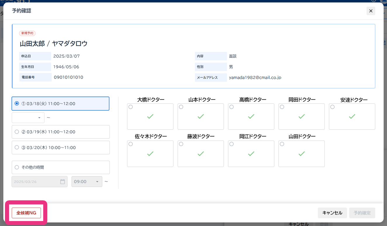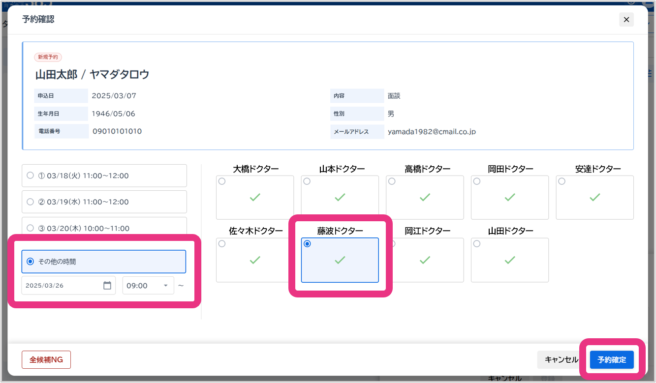 「その他の時間」を選択し面談可能な日時と担当ドクターを選択し、『予約確定』をクリックしてください。会員宛てに面談日時確定の案内メールが送信されます。