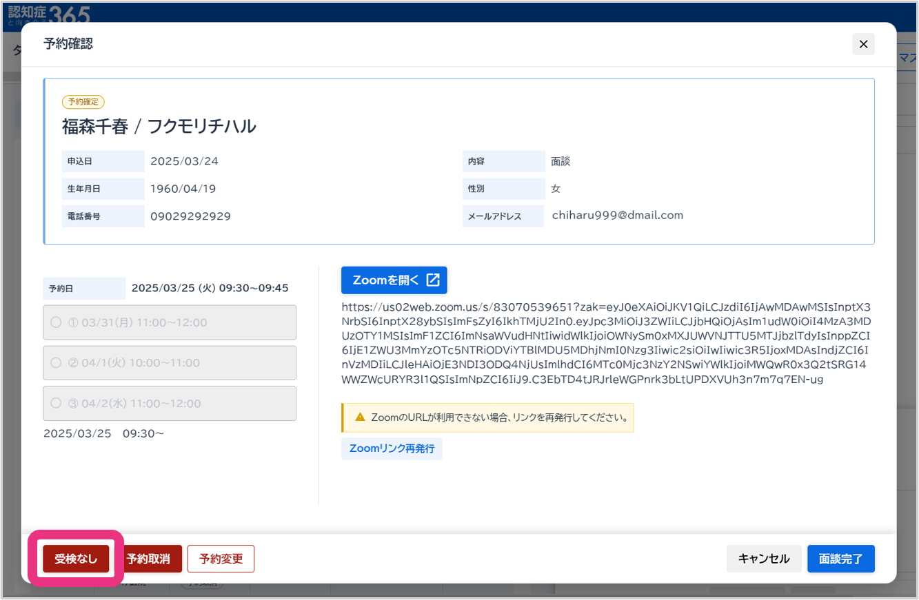 オンライン面談日時になっても会員がZoom会議に参加せず、無断キャンセルとなった場合は、予約ステータスを「受検なし」に変更する必要があります。