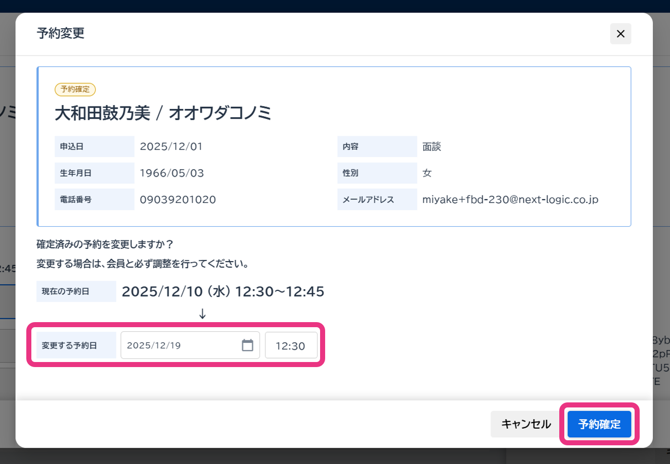 予約変更画面が表示されますので、会員、面談担当者と調整した日時を入力の上、『予約確定』をクリックしてください。