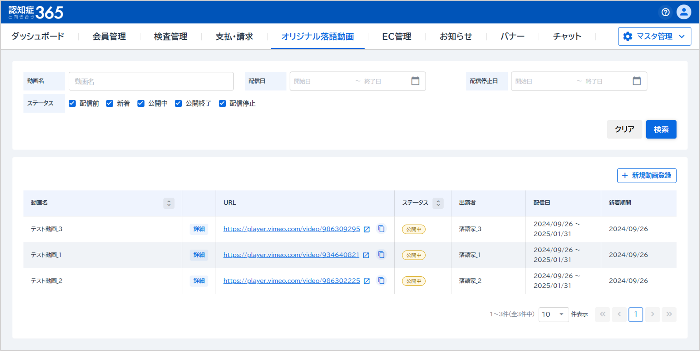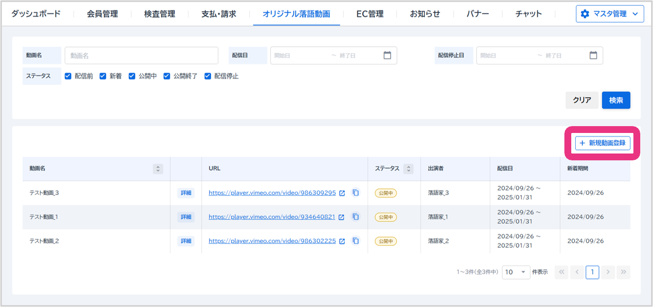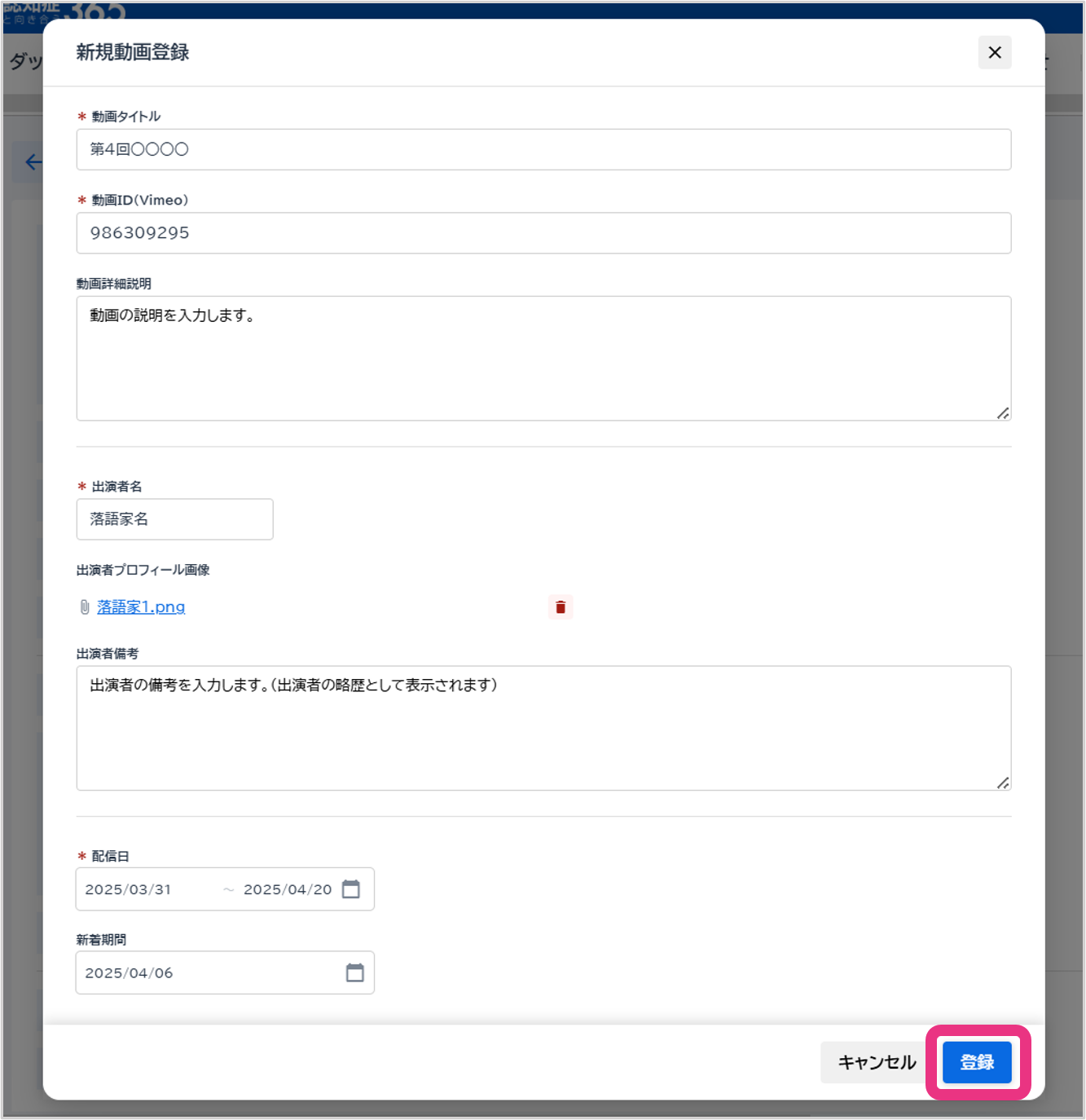 内容を編集し、『登録』をクリックしてください。落語動画が登録されます。