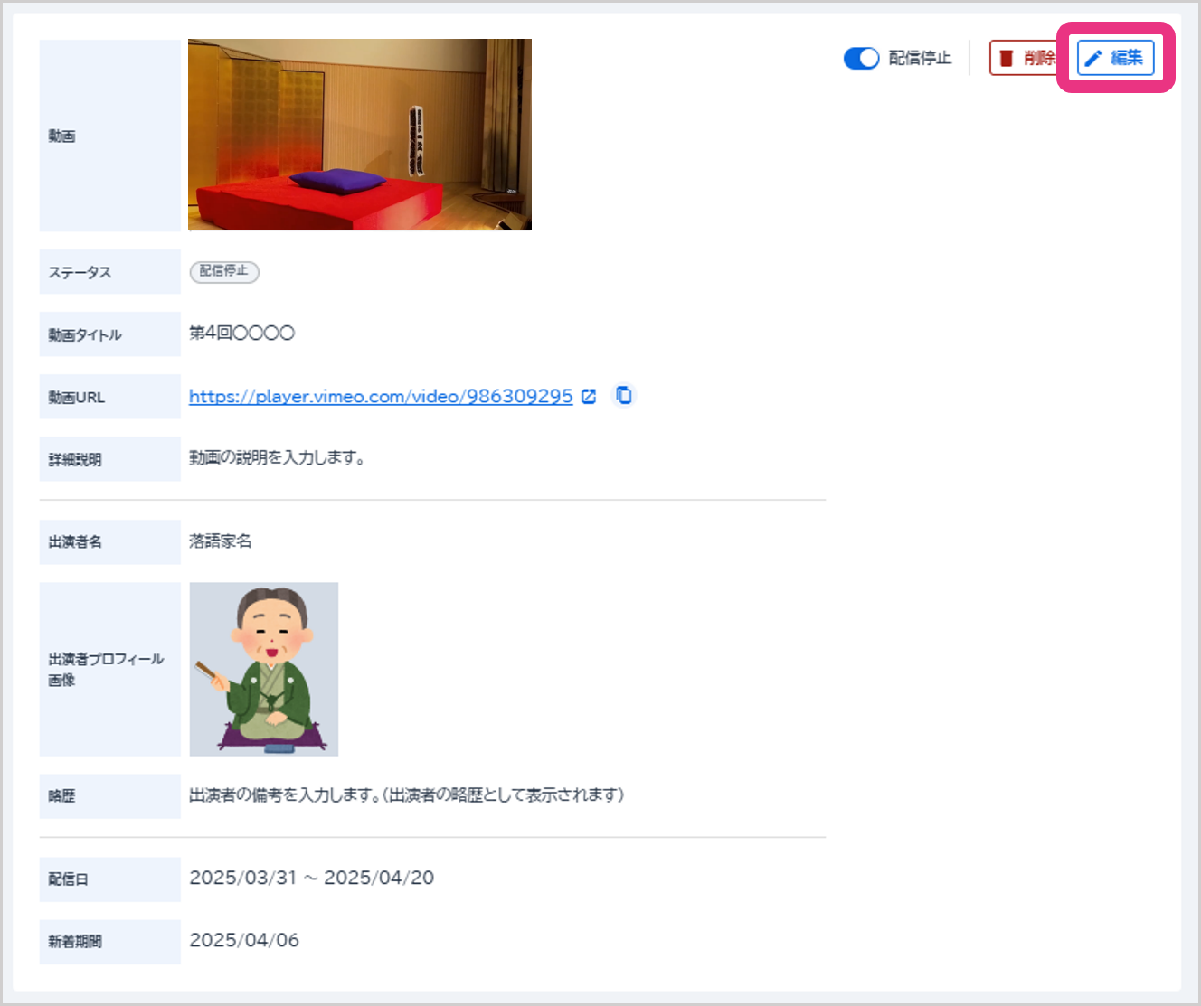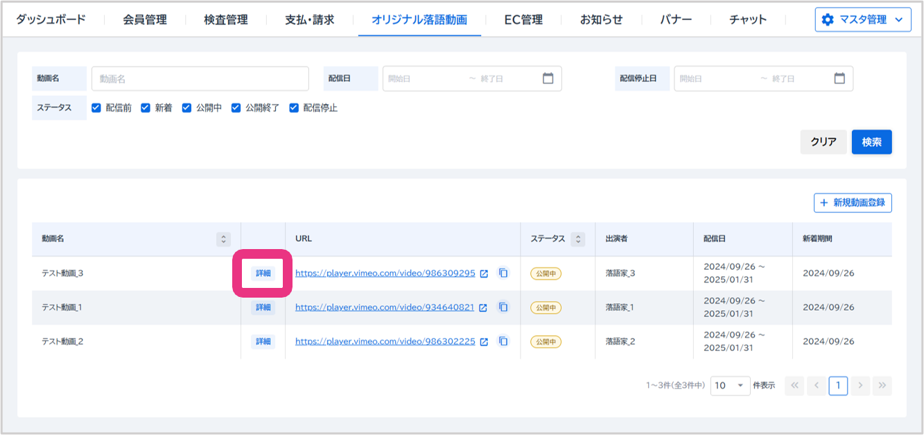 配信停止したいオリジナル落語動画の『詳細』をクリックしてください。