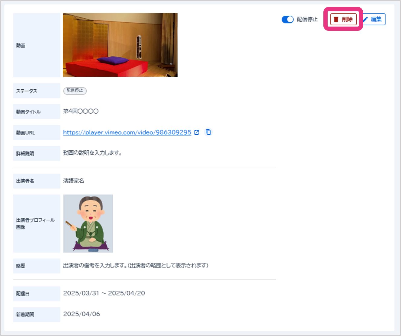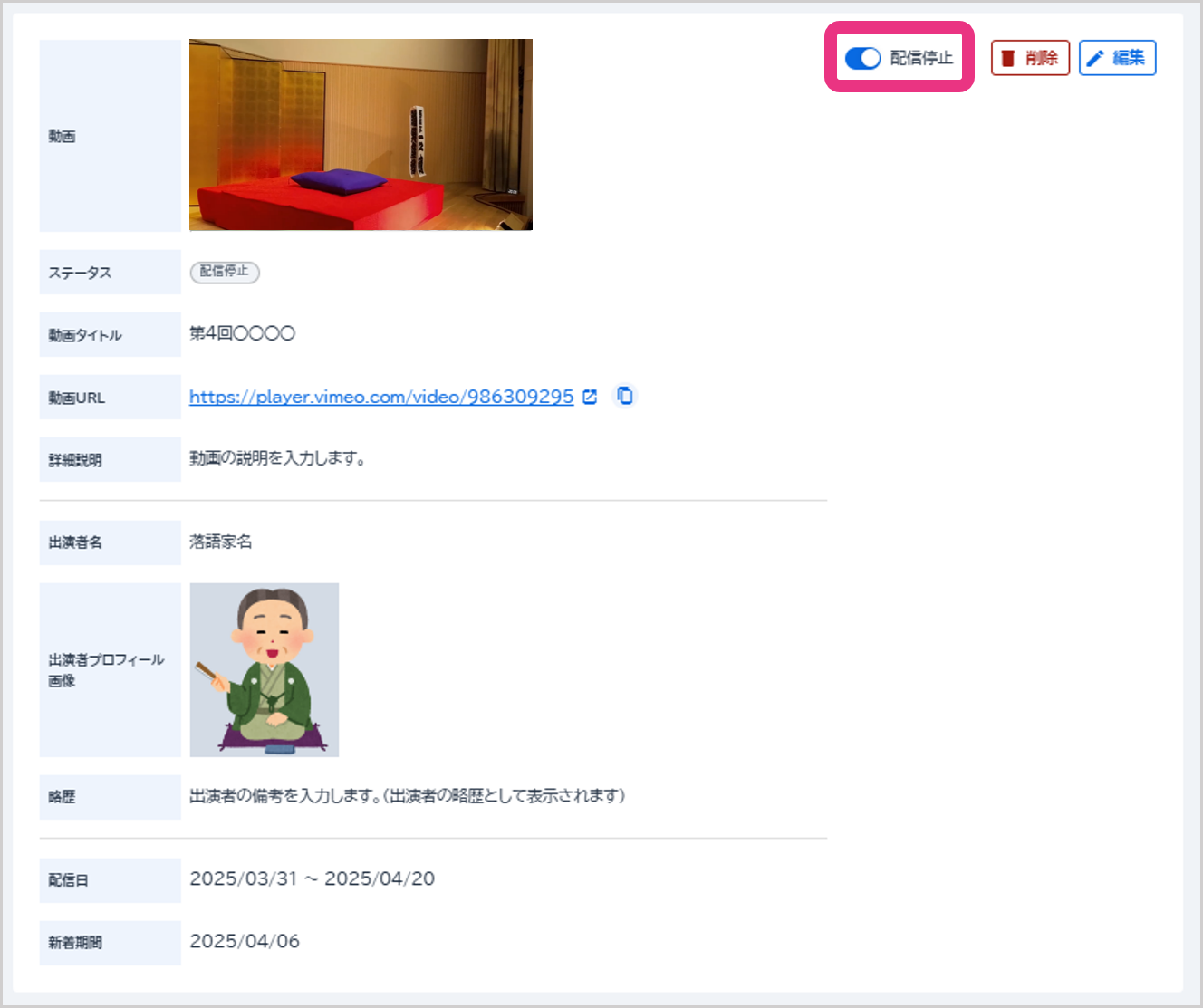 詳細が表示されますので、「配信停止」をONにしてください。落語動画の配信が停止されます。