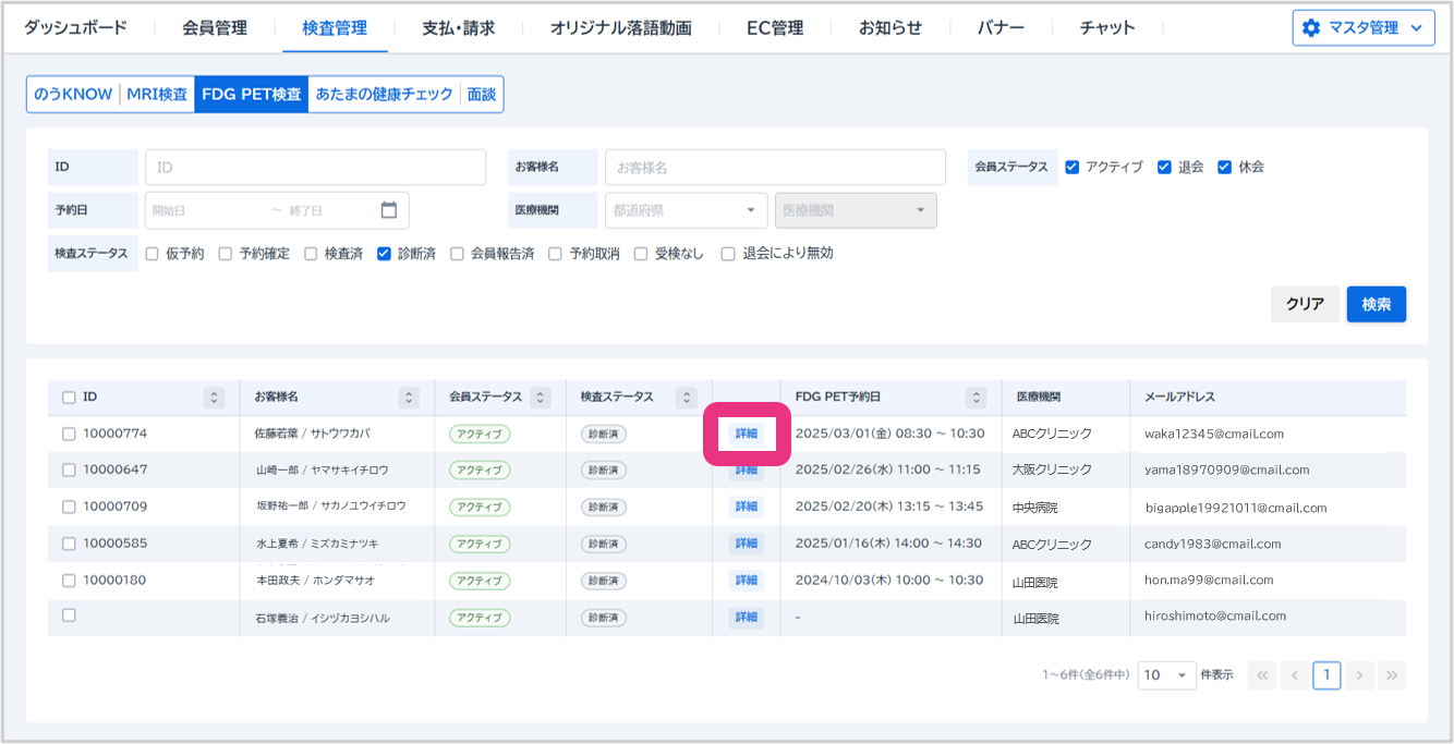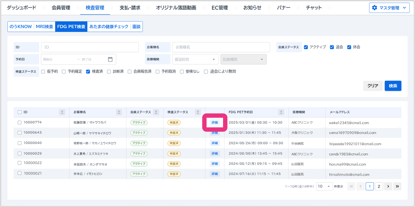 「検査済」ステータスで検索し、対象の検査の『詳細』をクリックしてください。