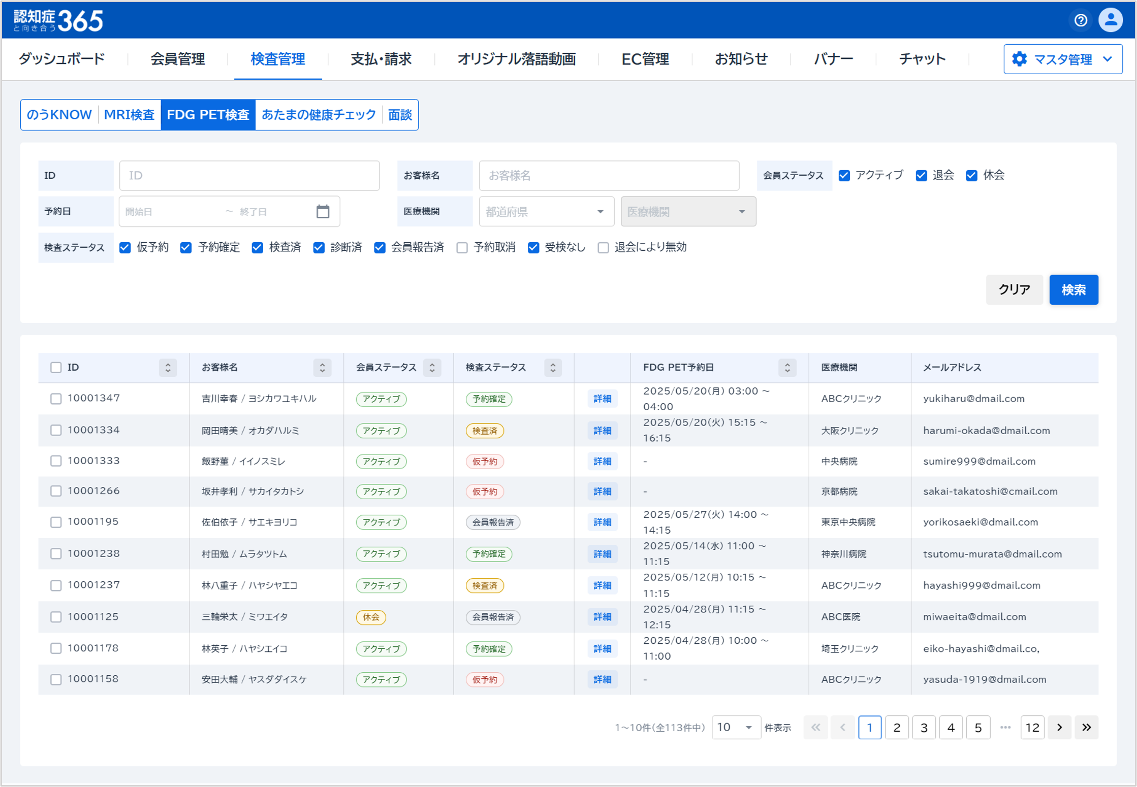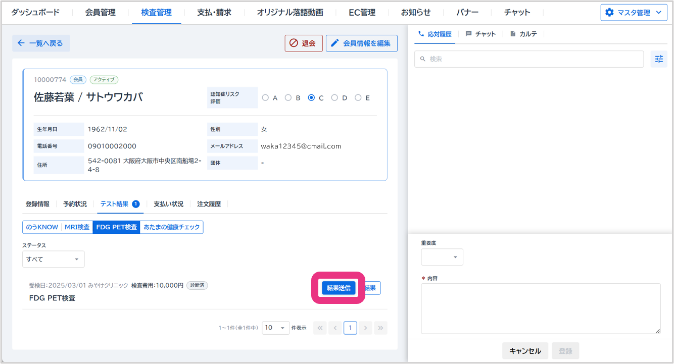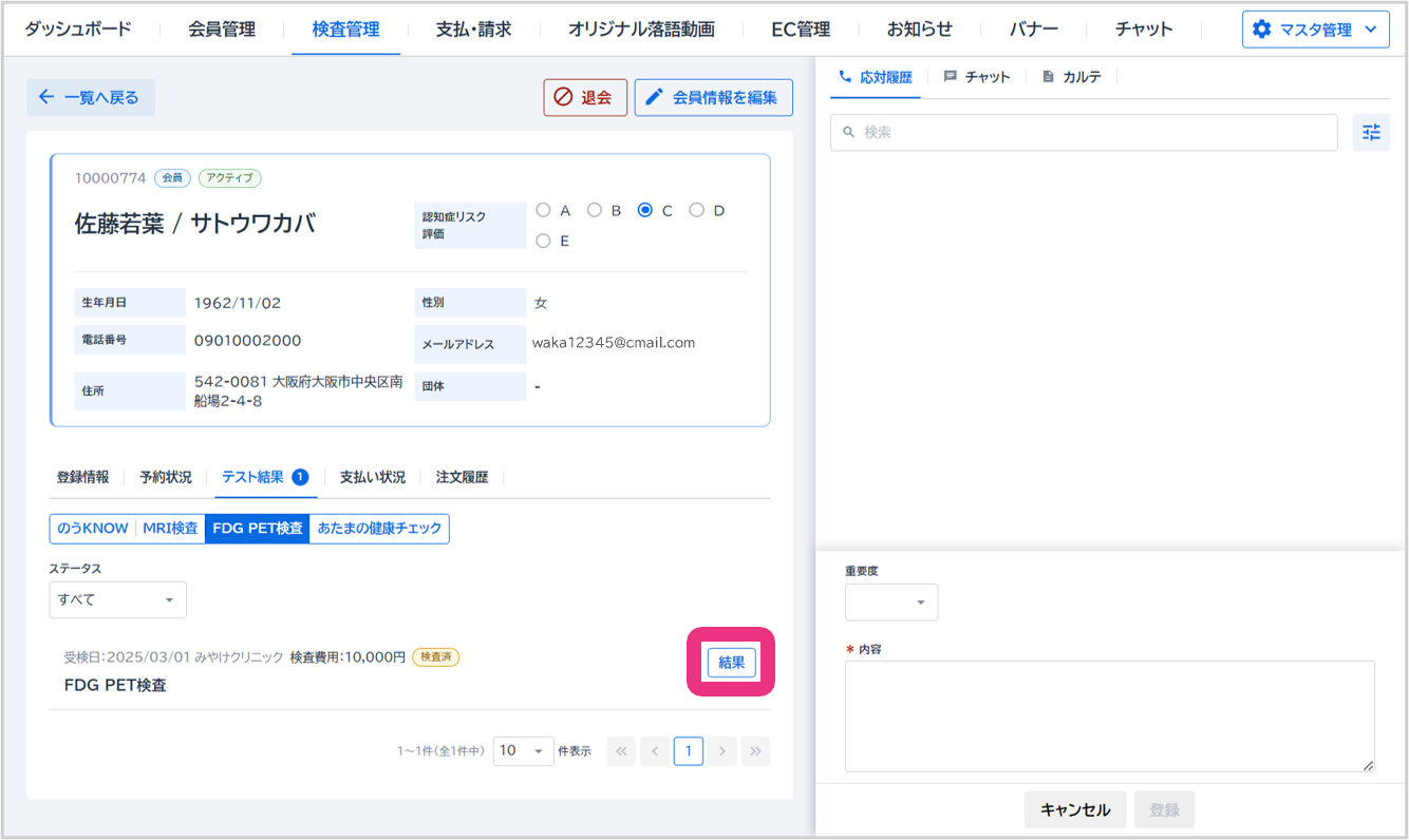 詳細『詳細』をクリックすると会員詳細の検査画面が開きます。