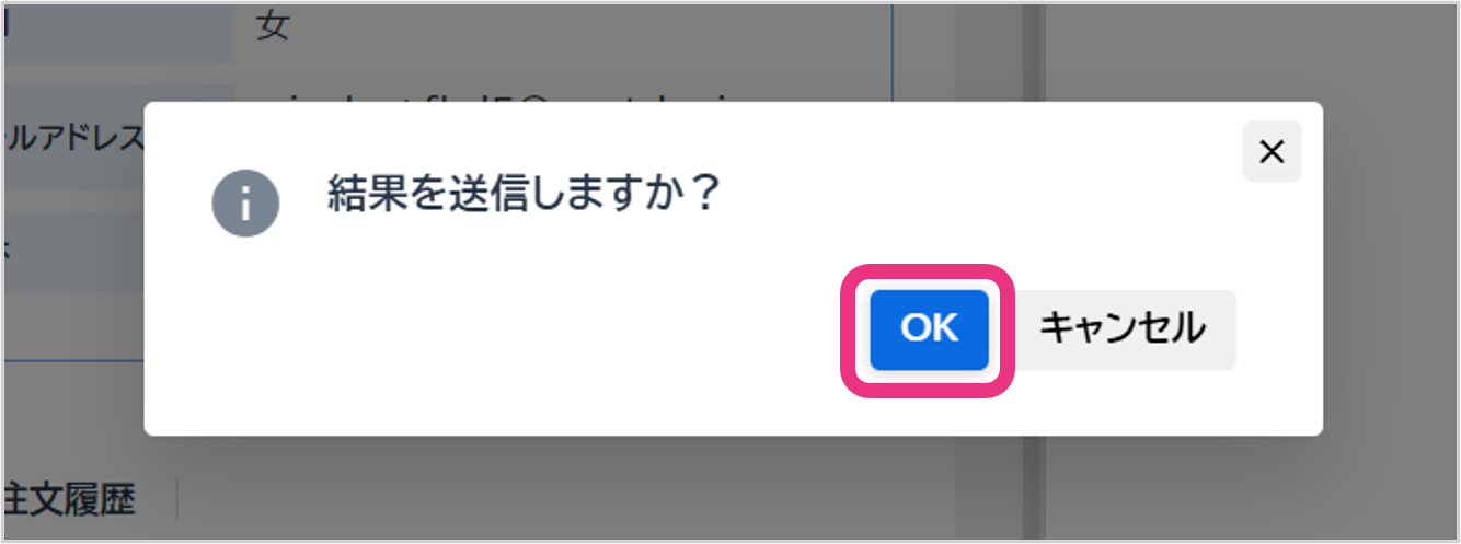 確認画面が表示されますので『OK』をクリックしてください。会員に結果が送信され、「会員報告済」ステータスに切り替わります。
